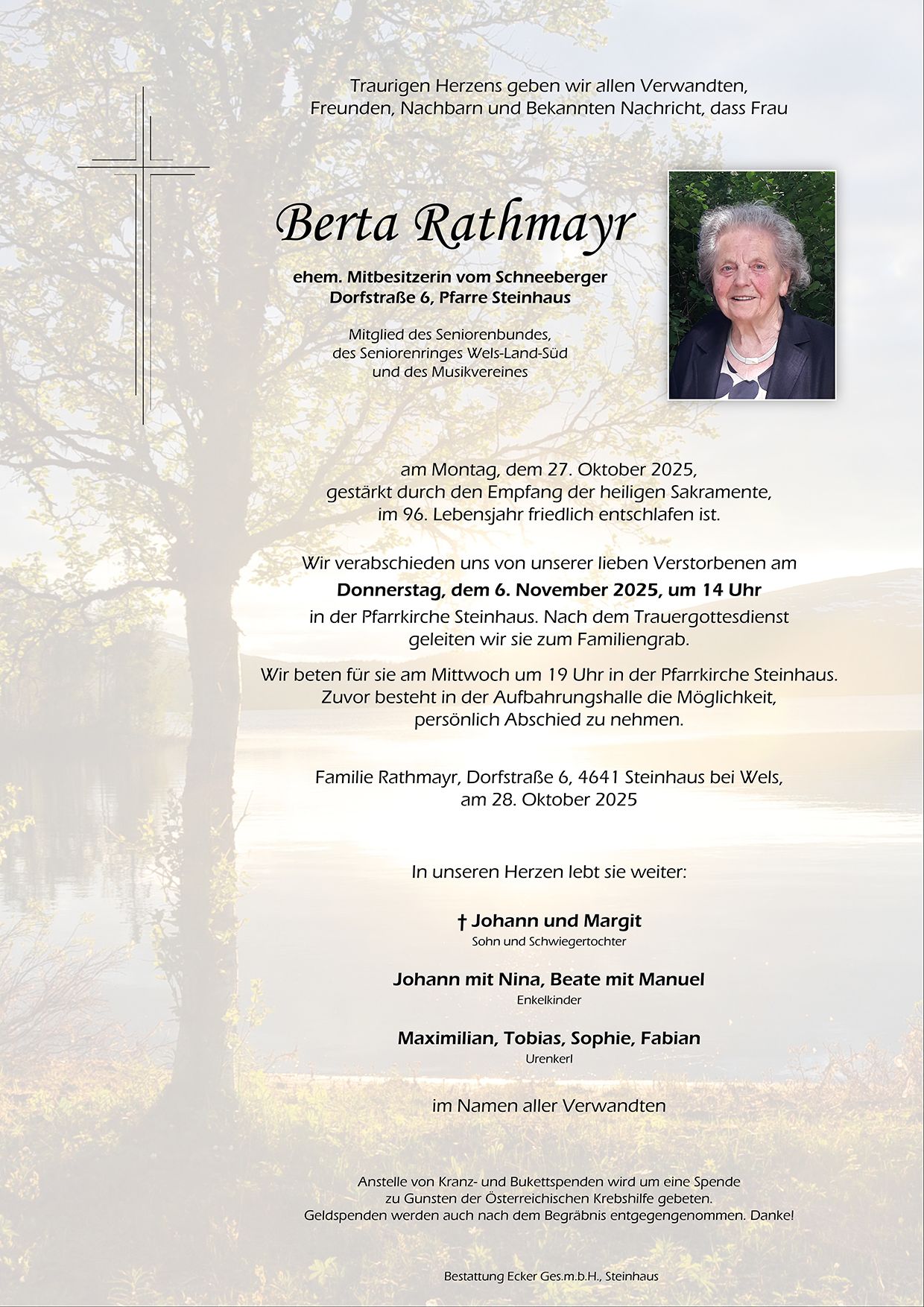 Liebe Familie Rathmayr, wir möchten euch unser aller herzliches Beileid aussprechen. Die Liebe, Dankbarkeit und die Erinnerung kann euch niemand mehr nehmen. Alles Liebe, Familie Dietl
