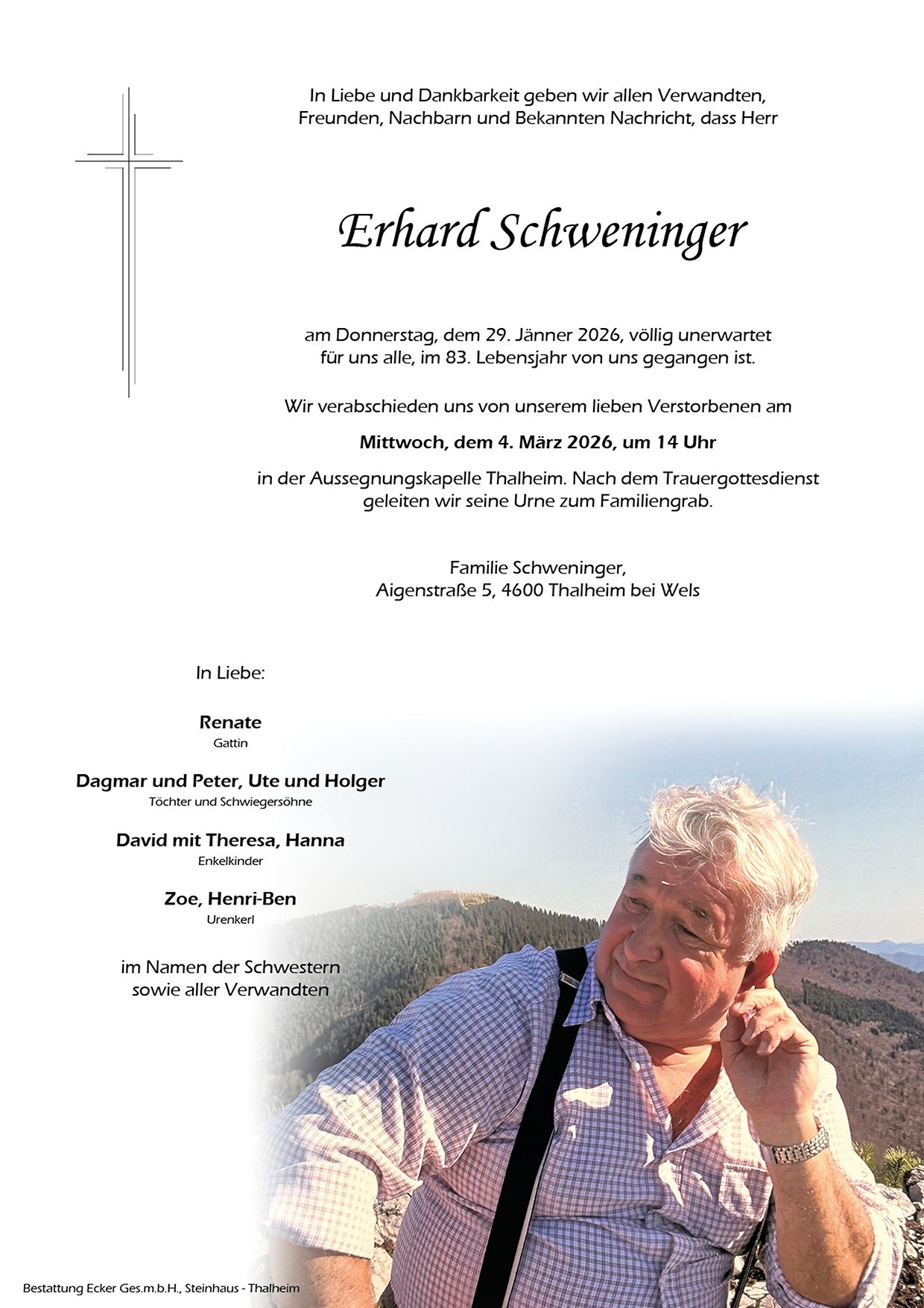 Liebe Frau Schweninger! Mit großer Trauer habe ich die Nachricht gelesen, dass Ihr Gatte überraschend verstorben ist. Erhard und ich haben uns von Kindesbeinen an gekannt und waren uns - ich glaube auch in seinem Namen sprechen zu können - sympathisch. Oft sind wir uns begegnet, haben ein paar
