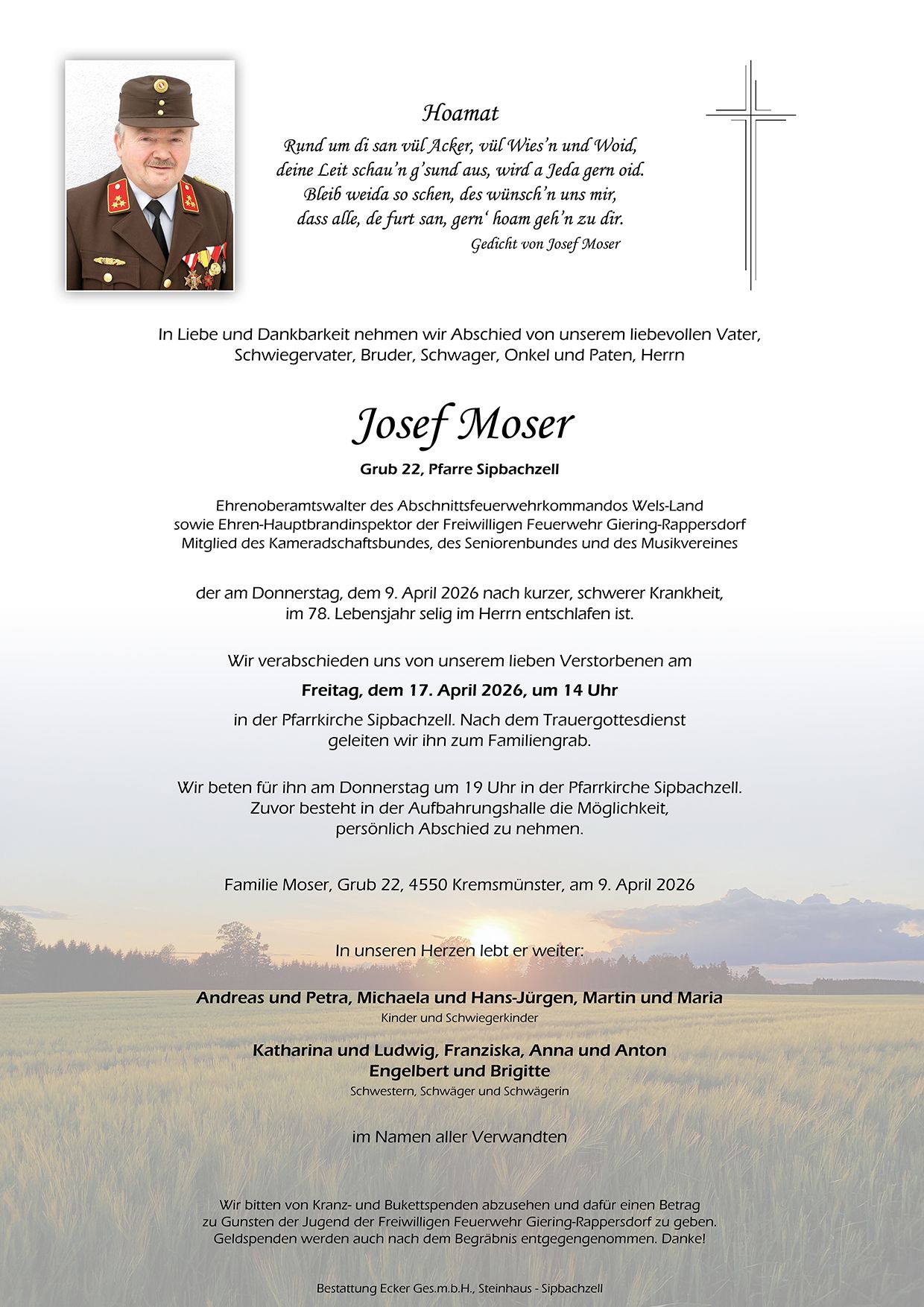 Ruhe in Frieden, Onkel Pepi. Unser aufrichtiges Beileid den Angehörigen und viel Kraft in dieser schweren Zeit. Manfred und Andrea Moser mit Familie, Esternberg