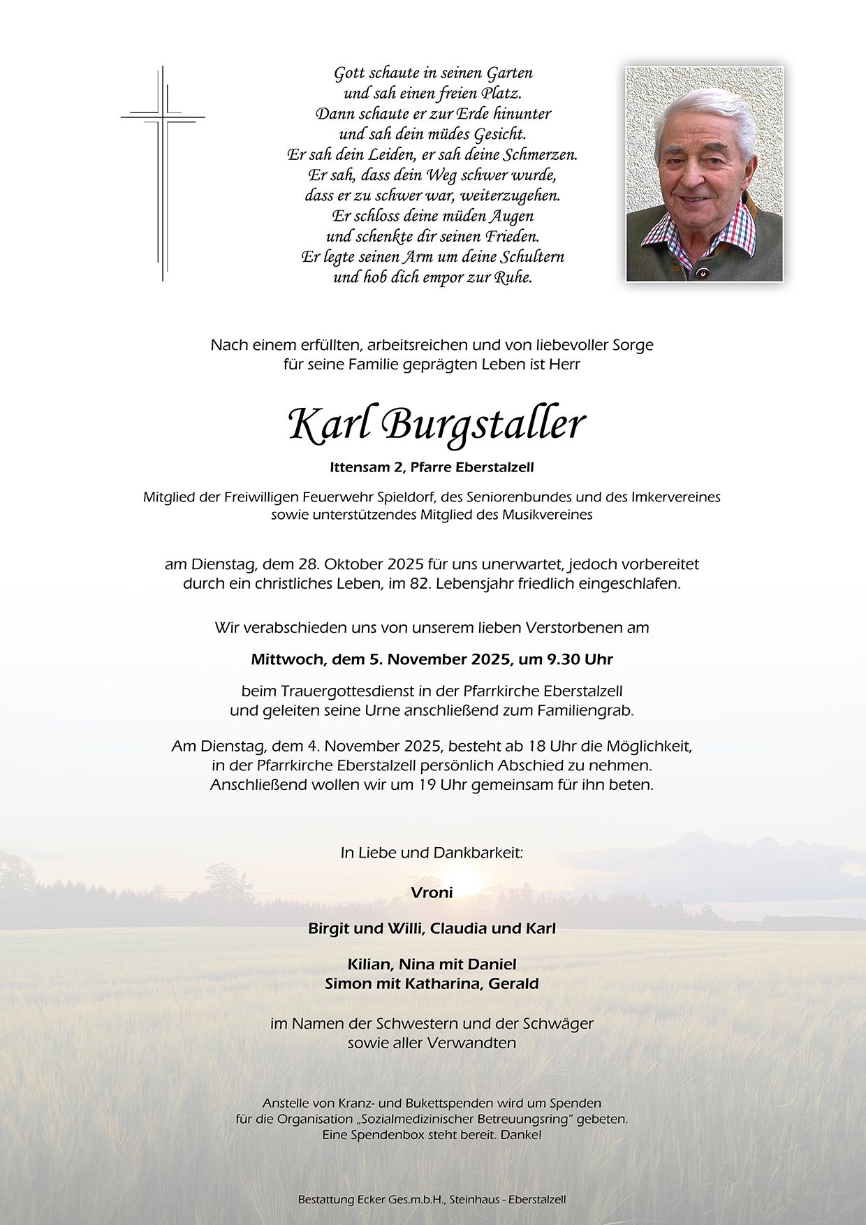 Es bleibt mir nur noch zu sagen,ich durfte schöne Stunden mit dir verbringen, hab Dank und gute Reise bis in alle Ewigkeit. Lieber Karl Danke dir herzlich für Deine jahrzehntelange Arbeit als Ausschußmitglied in unserem Musikverein. Der ganzen Trauerfamilie unsere herzliche Anteilnahme Ehrenkapellmeister Franz Obernberger mit Familie