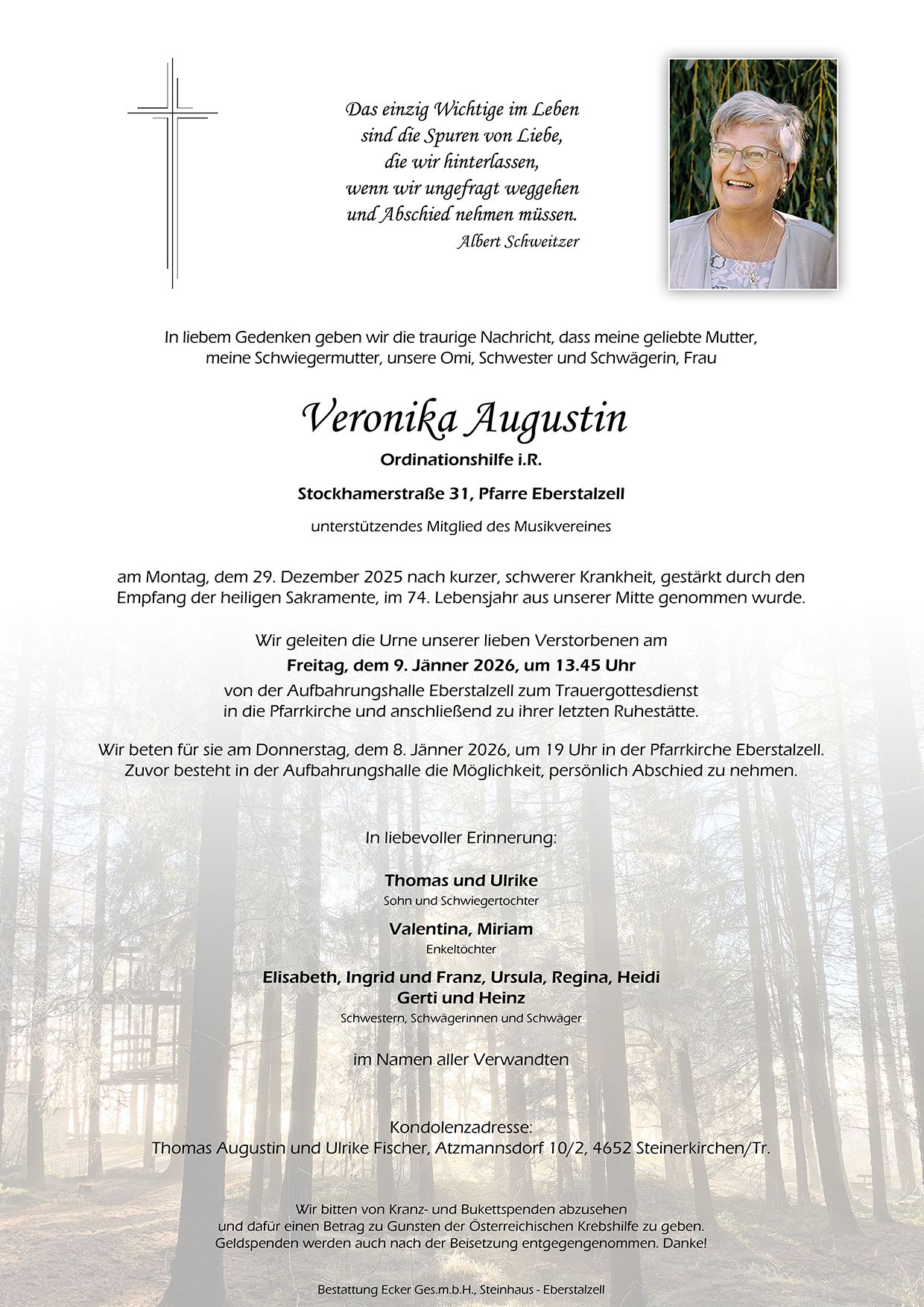 Liebe Veronika, danke für alles! Danke für die treue Unterstützung meines Vaters in der Ordination, danke für das Teilsein unseres Zuhauses und danke für die Stabilität, die du uns über all die Jahre geschenkt hast. Wir behalten dich, unsere Frau Augustin, in liebevoller Erinnerung. Liebe Trauerfamilie, unsere tiefe Anteilnahme! Familie Geroldinger